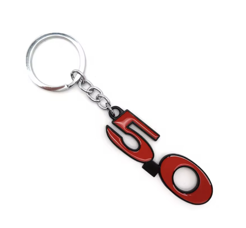 This double sided 5.0 key tag features a miniature image of the Mustang 5.0 Logo, done in red with a black outline.